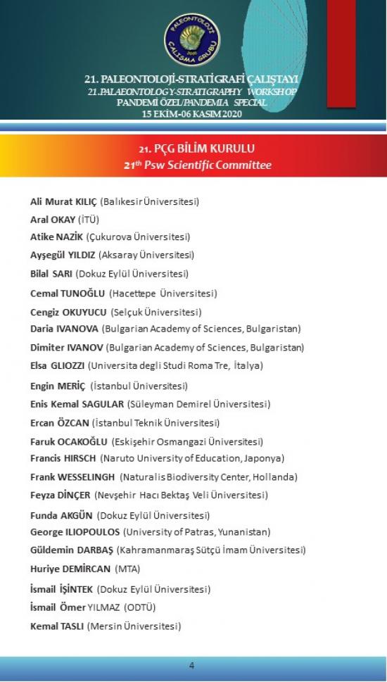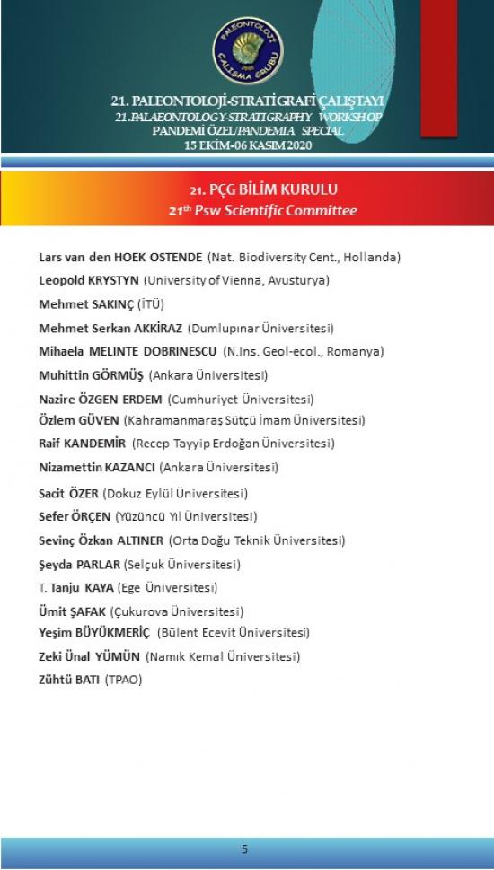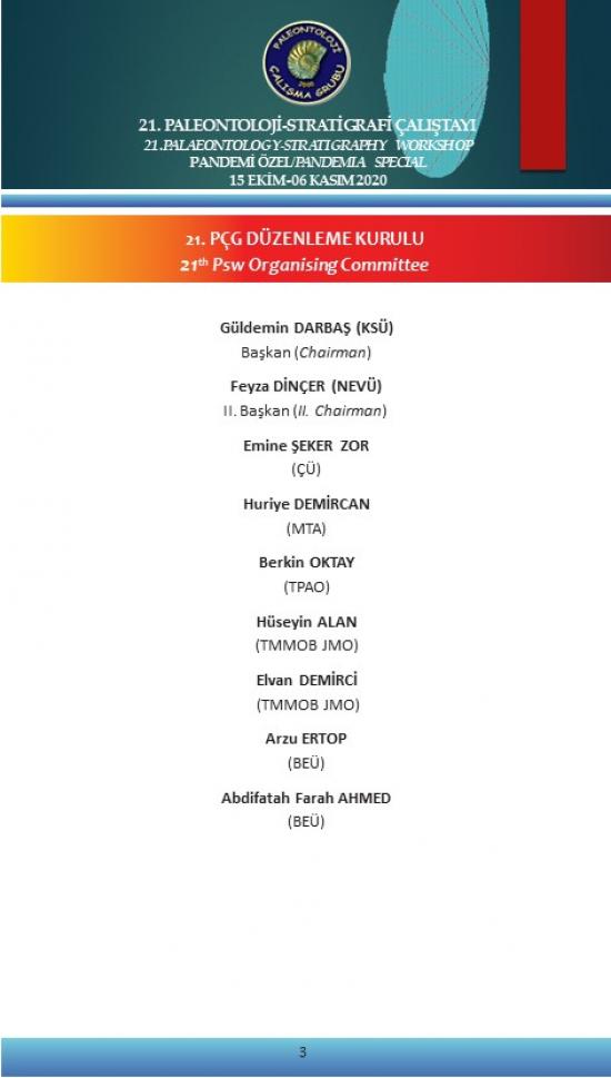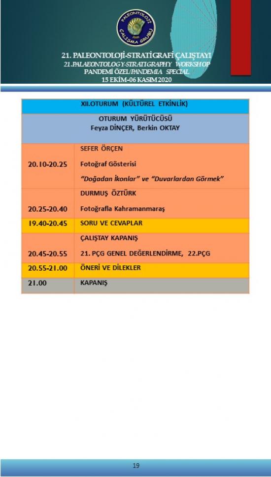 21. Paleontoloji Stratigrafi Çalıştayı 15 Ekim - 06 Kasım 2020 tarihleri arasında “21. PÇG PANDEMİ ÖZEL” başlığı altında “çevrimiçi” olarak yapılacaktır.