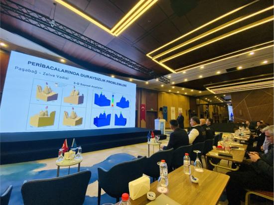 Söz konusu projede pilot uygulama olarak seçilen Balıklı-Üzümlü Kilisesi ve Yusuf Koç kilisesi kaya kütle özellikleri ve olası duraysızlıkları bölüm öğretim üyelerimiz tarafından değerlendirmiş ve kiliselerin riskli görülen bölümleri için bazı ıslah çalışmaları önerilmiştir. Öte yandan “Kapadokya Bölgesinde Doğal ve Kültürel Mirası Tehdit Eden Sorunlar ve Çözüm Yaklaşımları” başlıklı sunum öğretim üyemiz Prof. Dr. Mutluhan AKIN tarafından katılımcılar ile paylaşılmıştır.